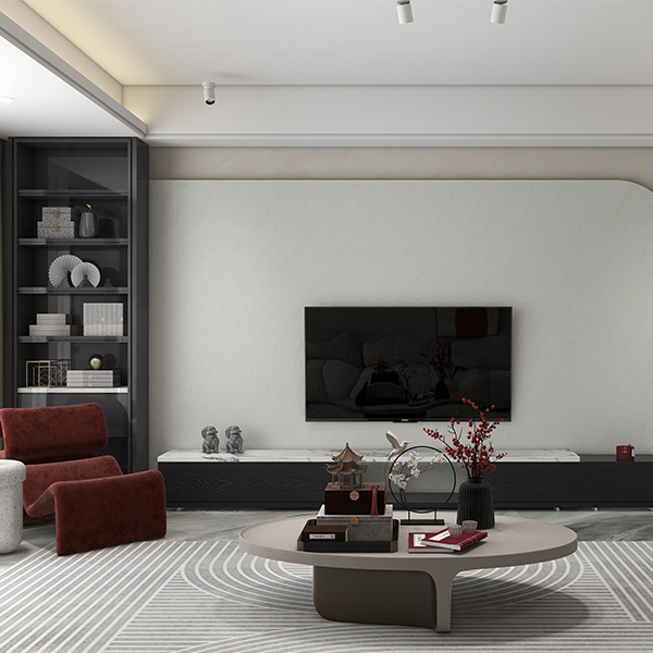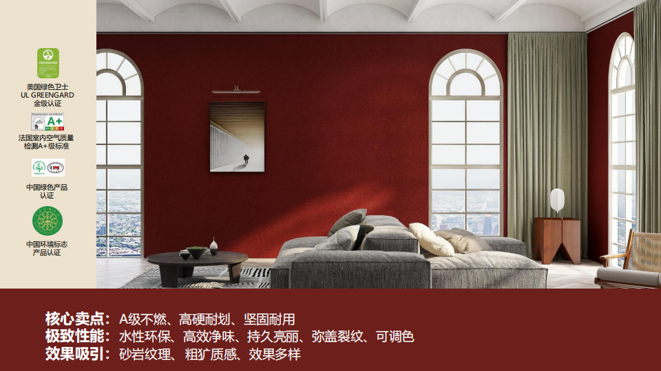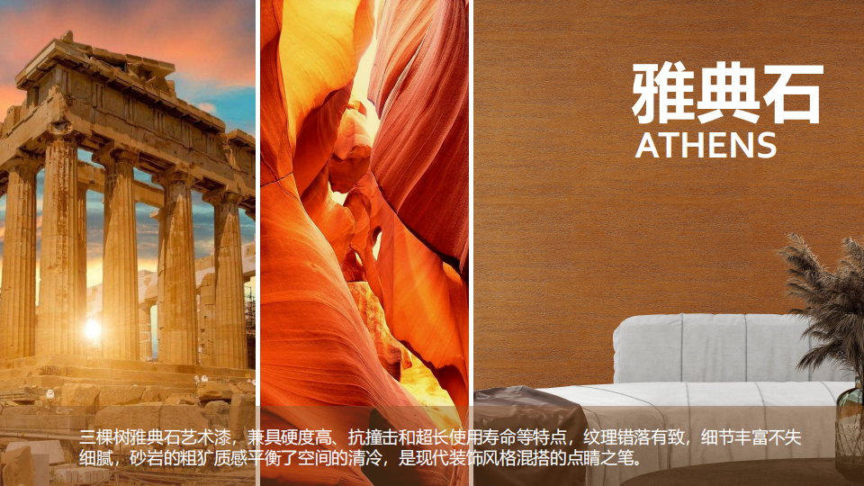 雅典石艺术漆,兼具硬度高、抗撞击和超长使用寿命等特点;纹理错落有致,细节丰富不失细腻,砂岩的粗犷质感平衡了空间的清冷,是现代装饰风格混搭的点晴之笔。