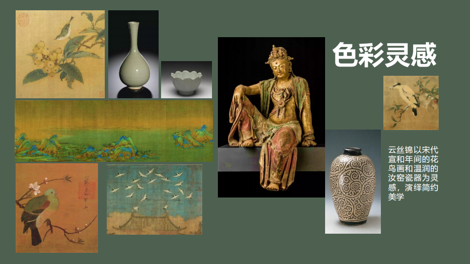 色彩灵感:云丝锦以宋代宣和年间的花鸟画和温润的汝窑瓷器为灵感,演绎简约美学
