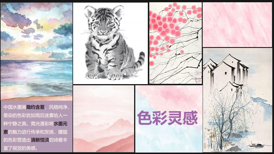 中国水墨画隐约含蓄,风格纯净晕染的色彩犹如雨后迷雾给人一种宁静之美。霓光漫彩将水墨元素的魅力进行传承和发扬,朦胧的色彩营造出清新恬淡的诗意丰富了视觉的美感。