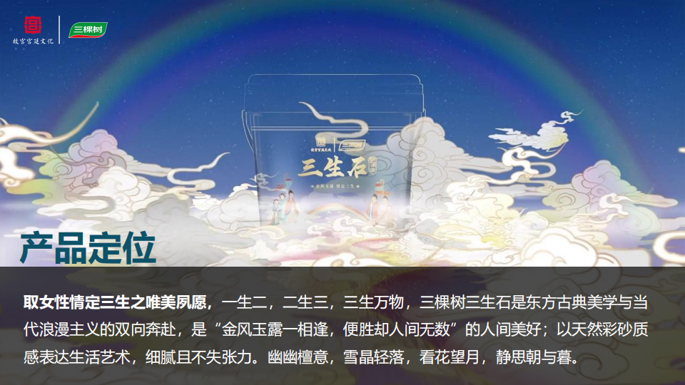 产品定位:取女性情定二生之唯美夙愿,一生二,二生二,三生万物,三棵树三生石是东方古典美学与当代浪漫主义的双向奔赴,是“金风玉露相逢,便胜却人间无数”的人间美好;以天然彩砂质感表达生活艺术,细腻且不失张力。幽幽檀意,雪晶轻落,看花望月,静思朝与暮。