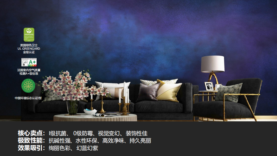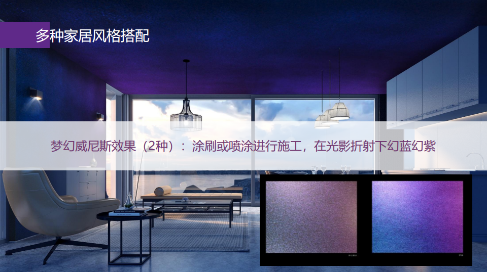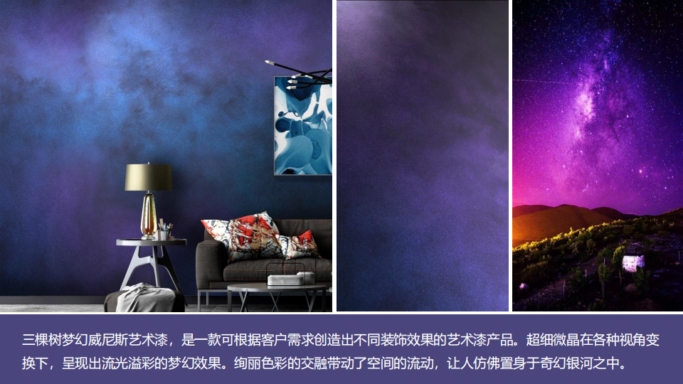 三棵树梦幻威尼斯艺术漆,是一款可根据客户需求创造出不同装饰效果的艺术漆产品。超细微晶在各种视角变换下,呈现出流光溢彩的梦幻效果。绚丽色彩的交融带动了空间的流动,让人仿佛置身于奇幻银河之中。