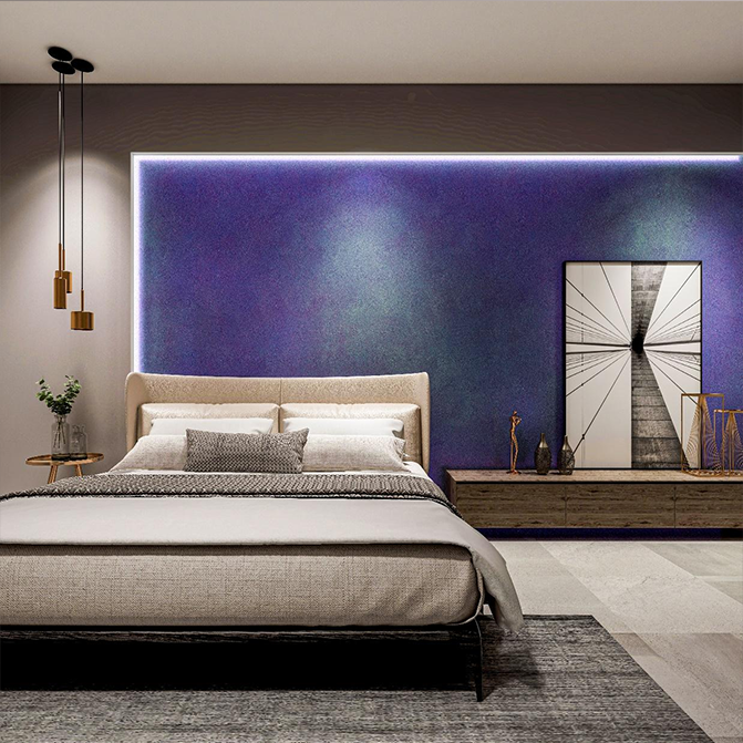 三棵树梦幻威尼斯艺术漆,是一款可根据客户需求创造出不同装饰效果的艺术漆产品。超细微晶在各种视角变换下,呈现出流光溢彩的梦幻效果。绚丽色彩的交融带动了空间的流动,让人仿佛置身于奇幻银河之中。